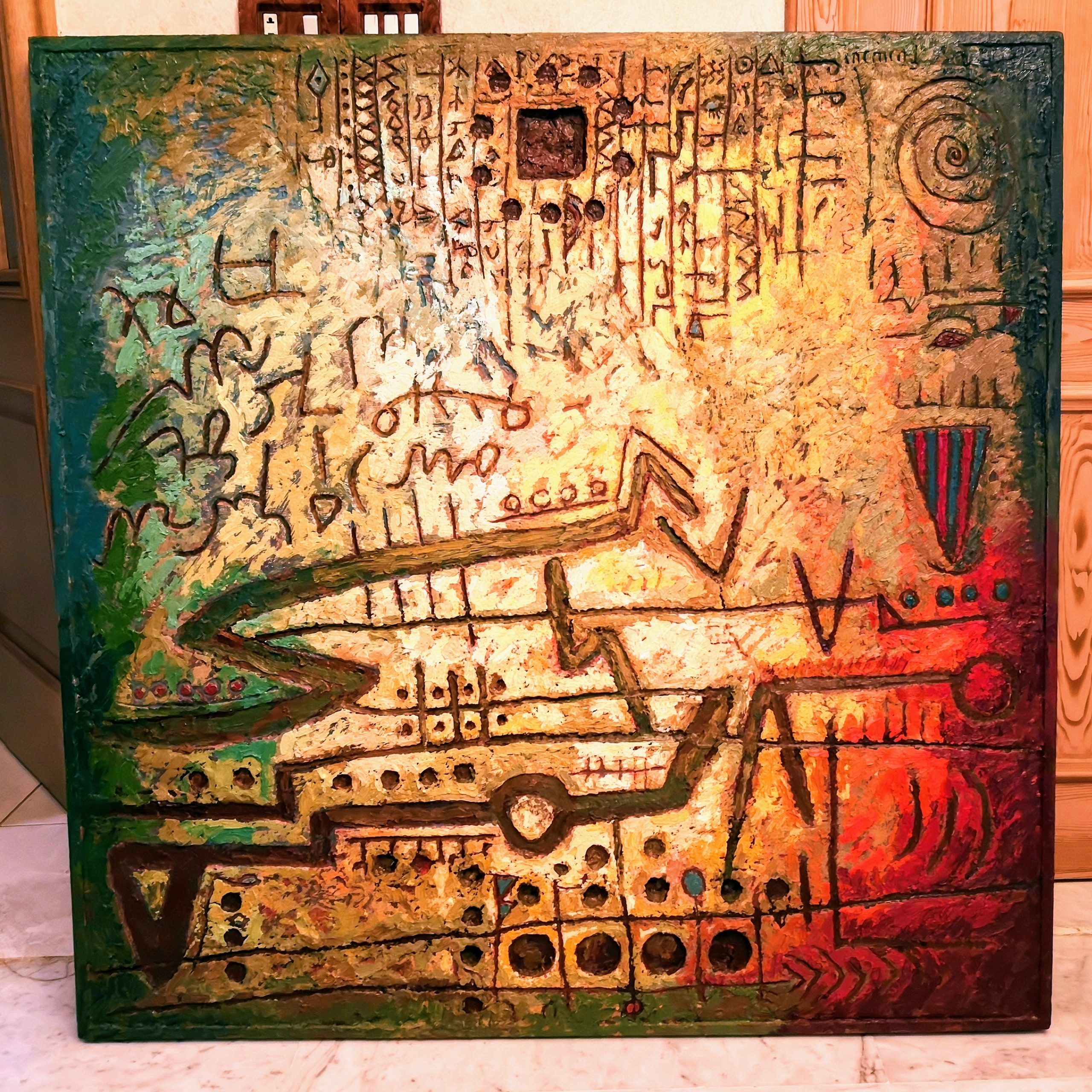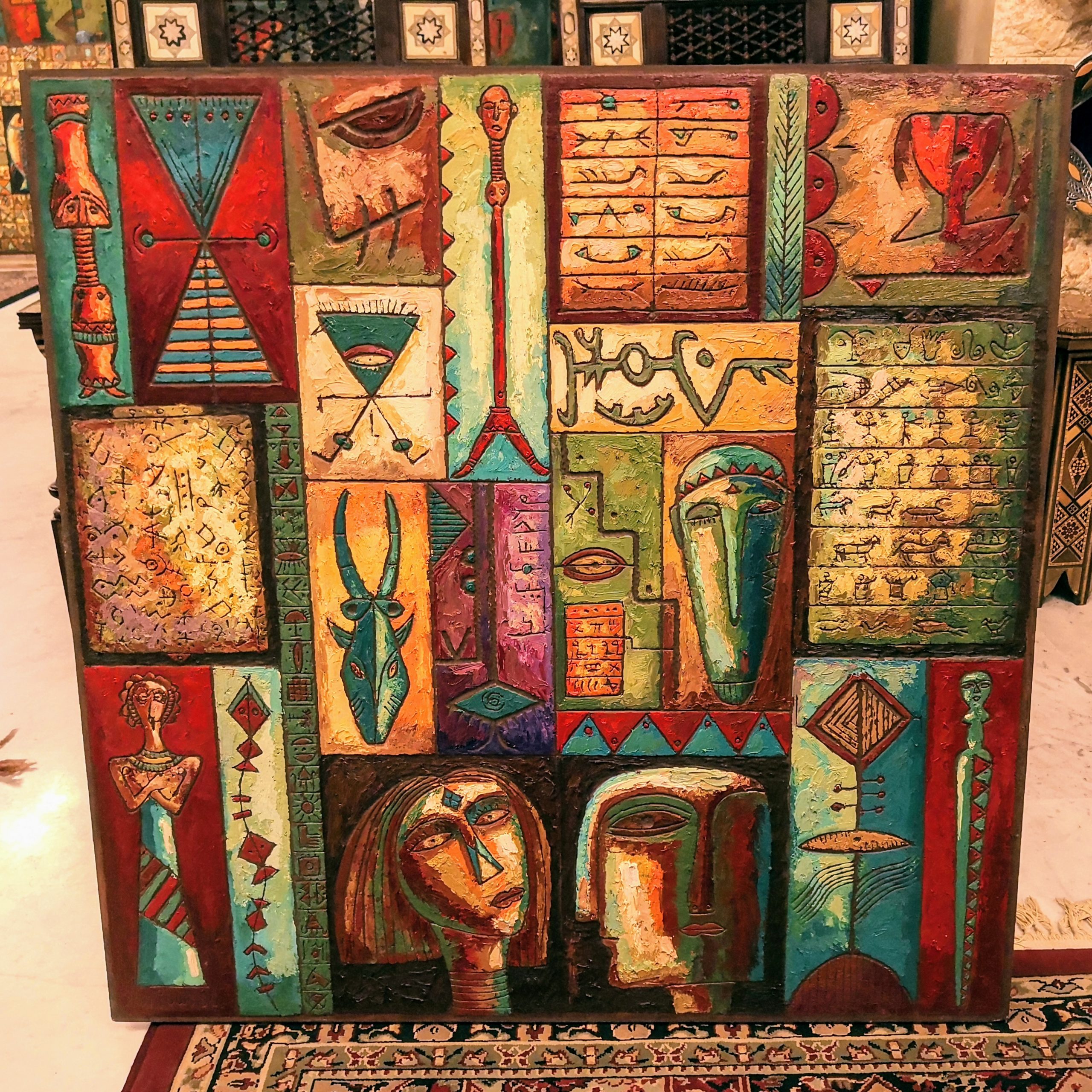 His paintings therefore combine knowledge and influences from these different disciplines. They are are interesting creations using a unique approach. A colorful palette and showing symbols from various Epoche and Geographic locations. Looking at his artworks, you will witness a time travel through Middle Eastern history, discovering influences from Sumerian, Nabateaen, Egyptian and many other people’s history. This, in combination with background and vast knowledge of Archaeology, Anthropology and Art history, he crafts unique pieces in his very own way.