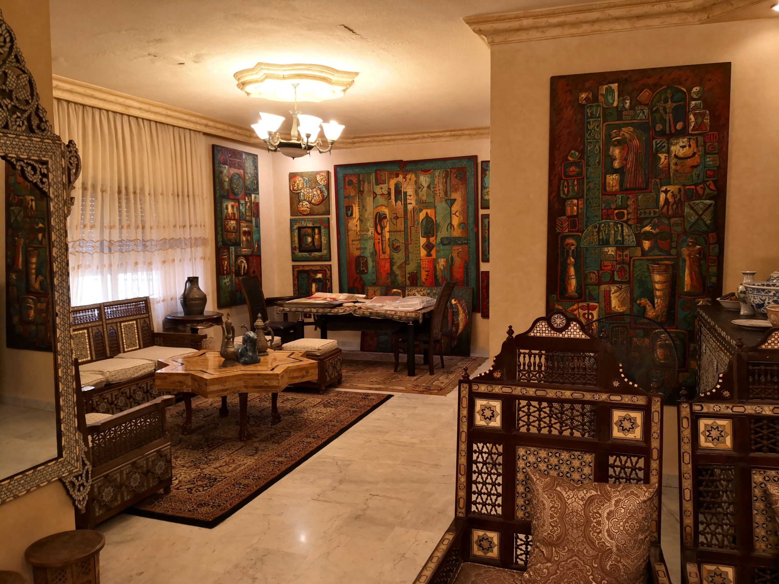 Occasionally, he hosts events, where you can view and purchase his artworks. You also can at anytime contact him to make an appointment to view his pieces. He lives in Khalda, Amman. After my first visit, I decided for three pieces which I can now call my own. I encourage you to have a look at his artworks in his home, where you will also find some Syrian Chests, using Mother of Pearl or other decoration items from the Middle East.