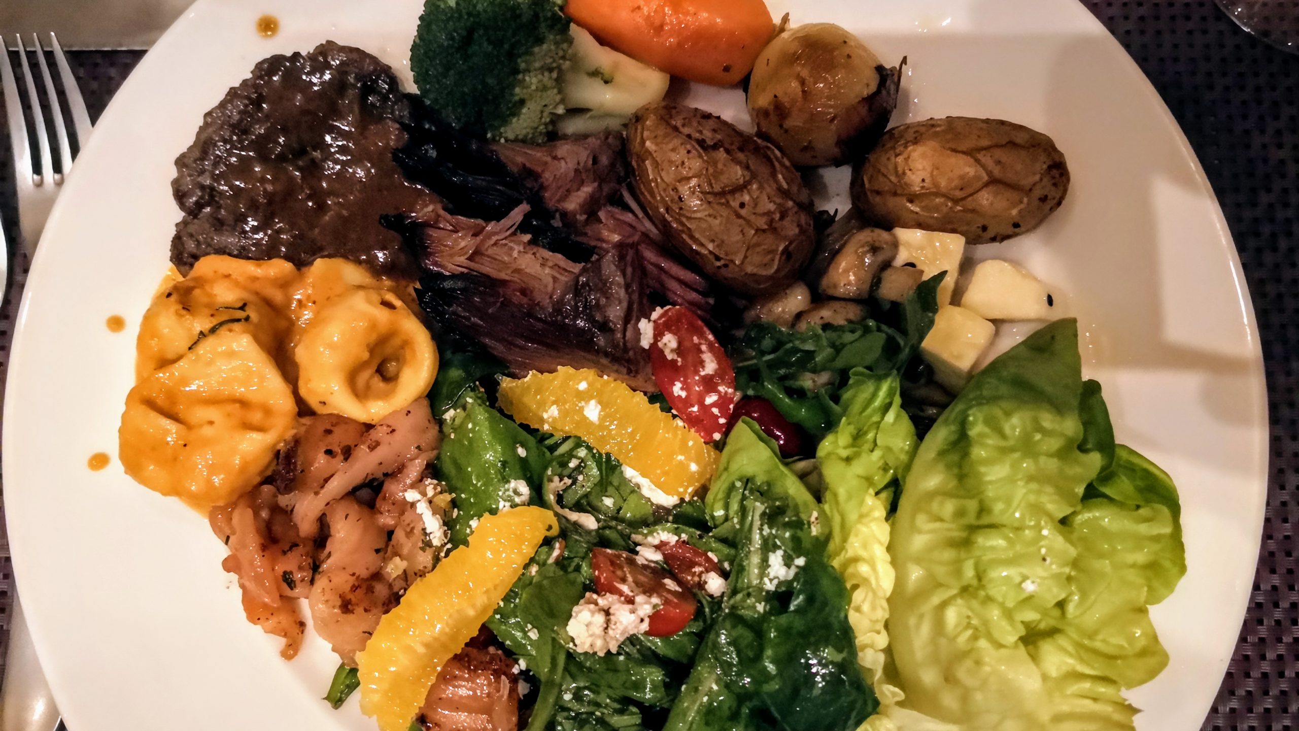 The buffet had a lot to offer from excellent salads to cold appetizers, seafood, a pasta station, grilled and steamed vegetables and an excellent brisket and meat cut just for you. The food was very delicious, had a huge variety and went of course well with the wine, or vice versa, I should say. There was a nice dessert as well. Some tiramisu creme brulee kind of cream as well as some ice cream balls covered in chocolate, very yummy.